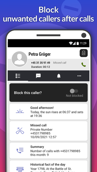 Entre sus características destacan la función de 'No molestar' basada en la ubicación, que silencia las llamadas en lugares específicos elegidos por el usuario, como en el trabajo o la biblioteca. La aplicación también ofrece opciones para añadir números a la lista de contactos o enviar mensajes de texto directamente. Con un acceso fácil a la configuración, Call Blocker se presenta como una herramienta sencilla y efectiva para mantener el control sobre las comunicaciones entrantes.